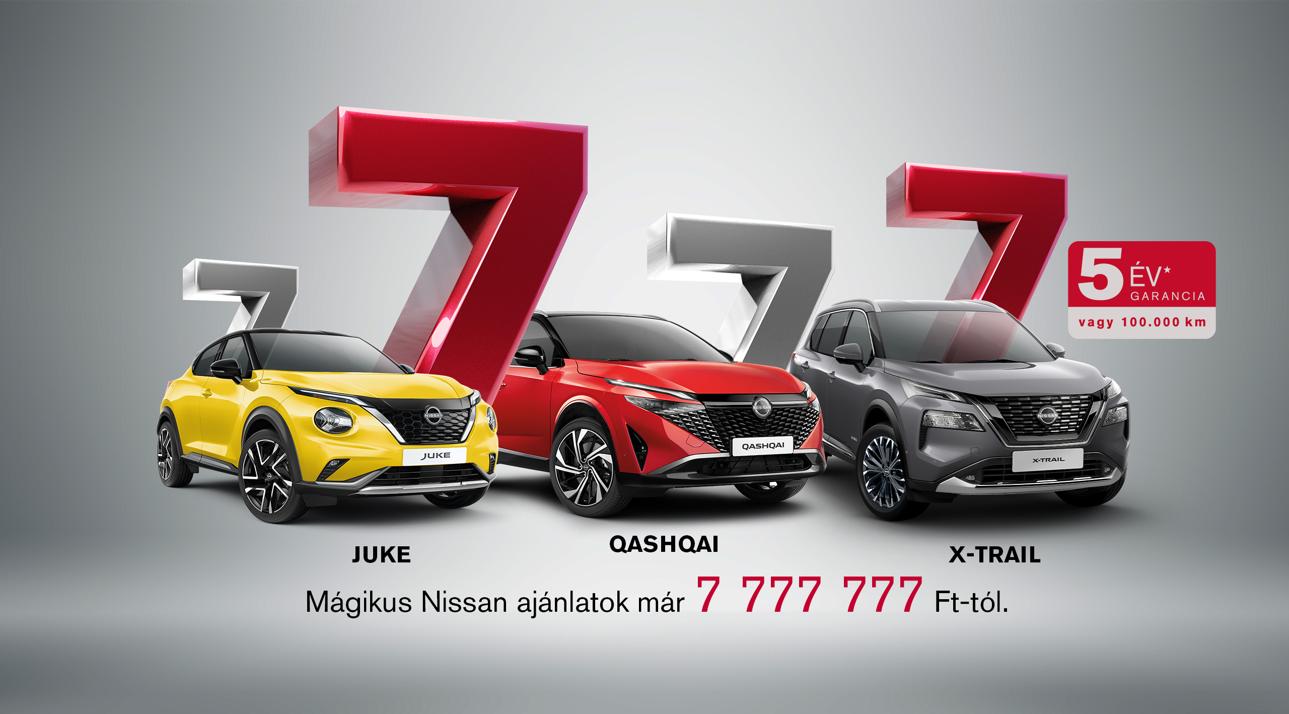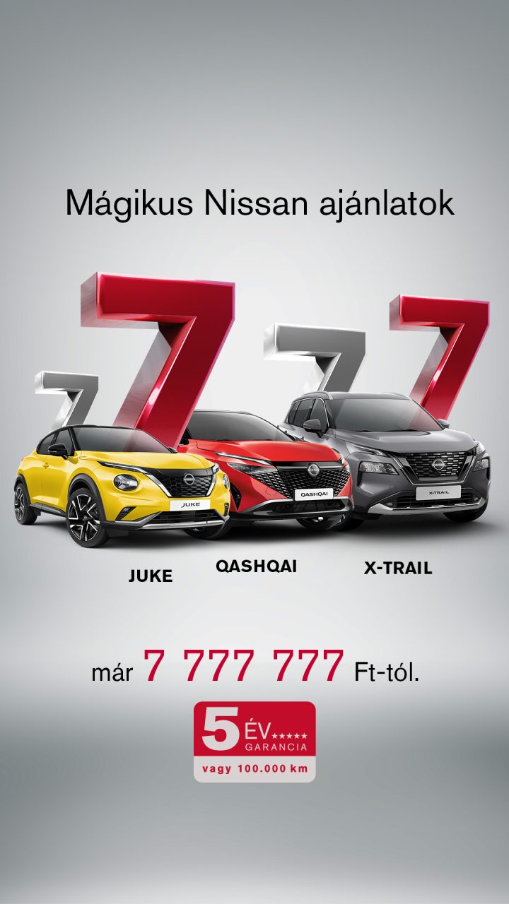 (1) Az ajánlat a 2025.10.16. – 2025.12.31. között megkötött ügyfélszerződésekre, a készlet erejéig, vagy visszavonásig érvényes. Az autót 2026. március 31-ig forgalomba kell helyezni. A feltüntetett, 7.777.777 Ft-os kezdő ár a „Nissan Juke 1.0 DIG-T 114 6MT Acenta, naplemente vörös” modellre vonatkozik. A feltüntetett árak kizárólag tájékoztató jellegűek, márkakereskedésenként eltérhetnek, és nem minősülnek kötelező érvényű ajánlattételnek. Az árak a magyar forint árfolyammozgásának és az ÁFA valamint regisztrációs adó változások függvényében változhatnak. A változtatás jogát fenntartjuk. A képek illusztrációk. További információk a Nissan márkakereskedőknél, valamint a nissan.hu vagy nissaneve.hu weboldalon.
