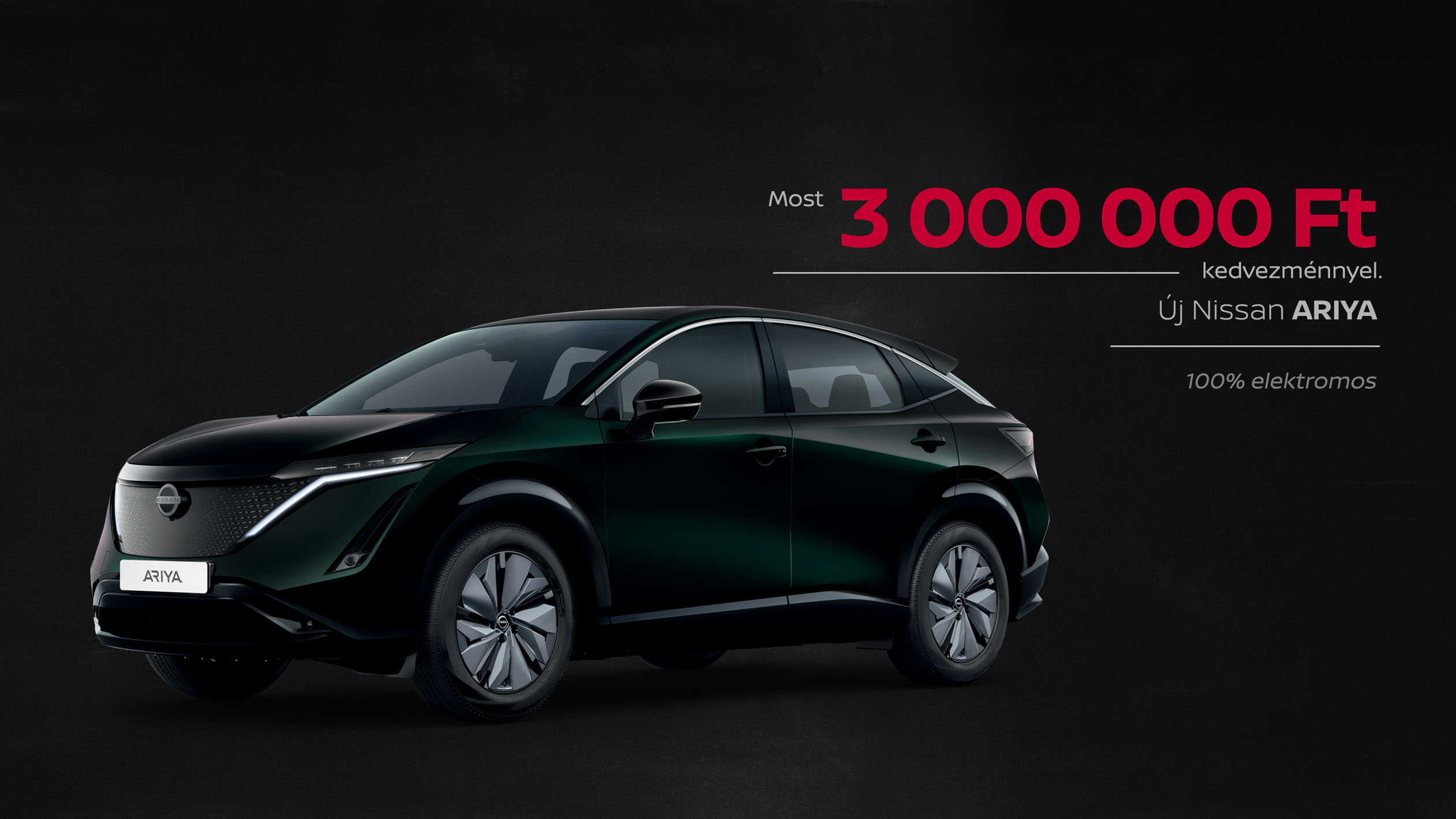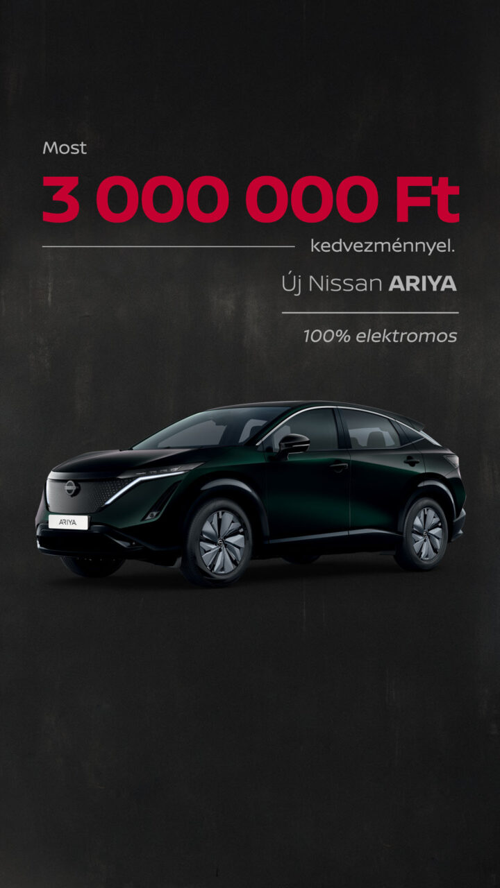 Hitelbiztosítéki nyilvántartásba vételi díj: 0 Ft. THM: 0,0%-0,3%. A THM nem tükrözi a finanszírozás kamatkockázatát és nem tartalmazza a casco biztosítás díját. A finanszírozás teljes futamideje alatt Casco biztosítás fenntartása szükséges. A finanszírozás minimális összege: 1.000.000 Ft. Az akció kizárólag új Nissan Juke, Qashqai, X-Trail és Ariya modellre érvényes. A tájékoztatás nem teljes körű és nem minősül szerződéses ajánlatnak, továbbá a finanszírozó fenntartja a finanszírozási kondíciók változtatásának, valamint az akció visszavonásának jogát. Az akció 2025.09.30-ig vagy visszavonásig érvényes. Jelen ajánlatban meghatározott feltételek lejárat időpontjáig benyújtott finanszírozási kérelmek esetén alkalmazandók, amennyiben az ügyfél megfelel a bírálati feltételeknek. Az ajánlatban szereplő finanszírozási kondíciók érvényességét befolyásolja a kereskedő partnereknél rendelkezésre álló készlet.