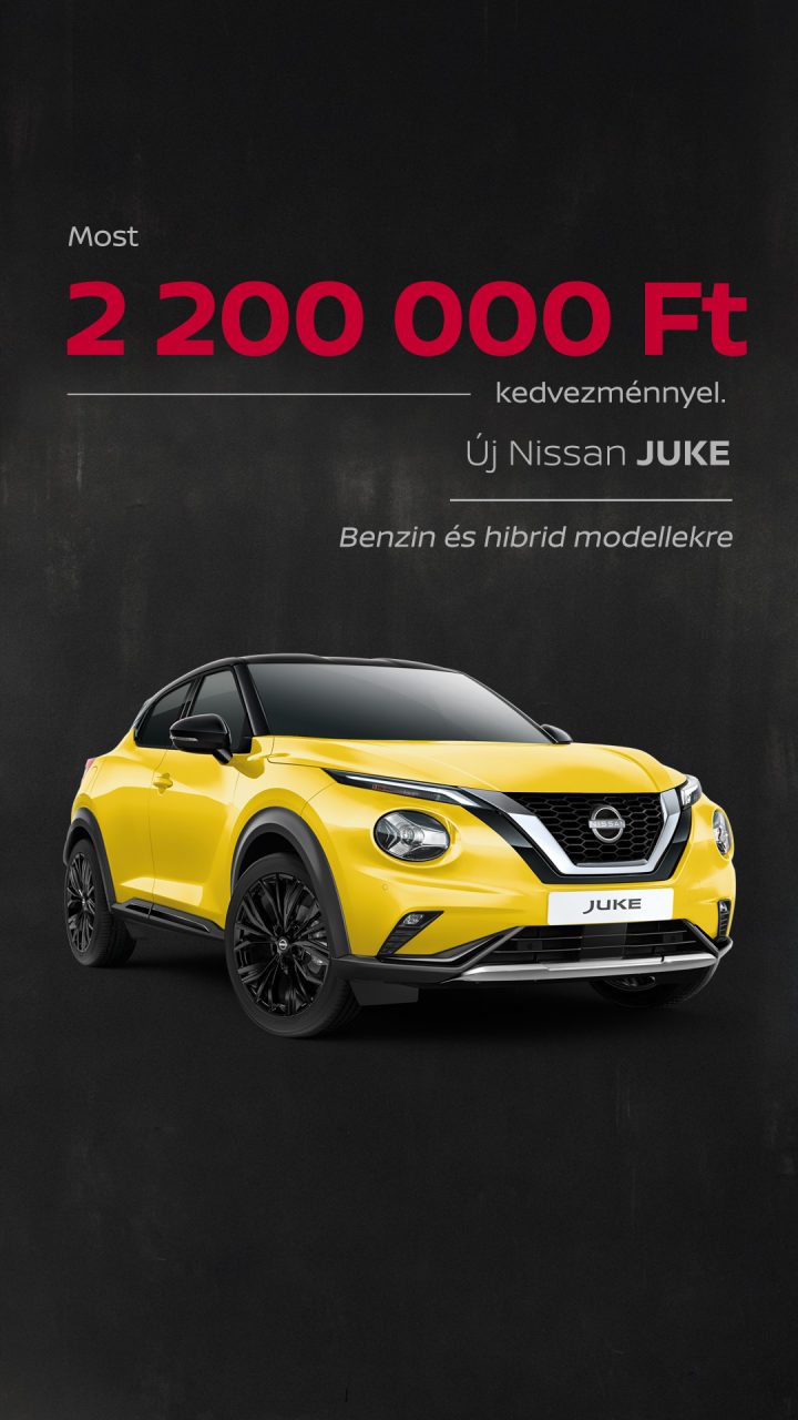 (1) Az ajánlat a 2025.10.16. – 2025.12.31. között megkötött ügyfélszerződésekre, a készlet erejéig, vagy visszavonásig érvényes. Az autót 2026. március 31-ig forgalomba kell helyezni. A feltüntetett, 7.777.777 Ft-os kezdő ár a „Nissan Juke 1.0 DIG-T 114 6MT Acenta, naplemente vörös” modellre vonatkozik. A feltüntetett árak kizárólag tájékoztató jellegűek, márkakereskedésenként eltérhetnek, és nem minősülnek kötelező érvényű ajánlattételnek. Az árak a magyar forint árfolyammozgásának és az ÁFA valamint regisztrációs adó változások függvényében változhatnak. A változtatás jogát fenntartjuk. A képek illusztrációk. További információk a Nissan márkakereskedőknél, valamint a nissan.hu vagy nissaneve.hu weboldalon.