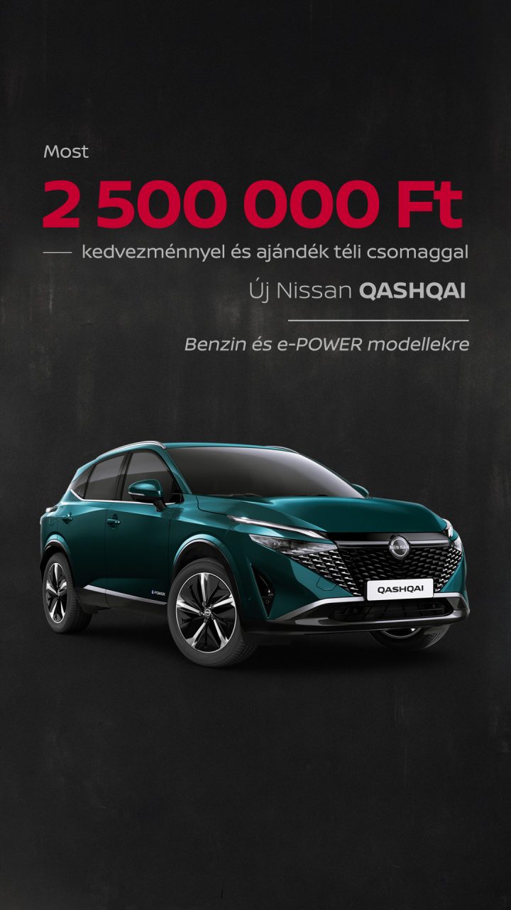 (3) Az ajánlat egyéni vállalkozók, cégek, társas vállakozások részére elérhető, a 2025.10.16. – 2025.12.31. között megkötött ügyfélszerződésekre, a készlet erejéig, vagy visszavonásig érvényes. Az autót 2026. március 31-ig forgalomba kell helyezni. A feltüntetett árak kizárólag tájékoztató jellegűek, márkakereskedésenként eltérhetnek, és nem minősülnek kötelező érvényű ajánlattételnek. Az árak a magyar forint árfolyammozgásának és az ÁFA valamint regisztrációs adó változások függvényében változhatnak. A változtatás jogát fenntartjuk. A képek illusztrációk. További információk a Nissan márkakereskedőknél, valamint a nissan.hu vagy nissaneve.hu weboldalon.